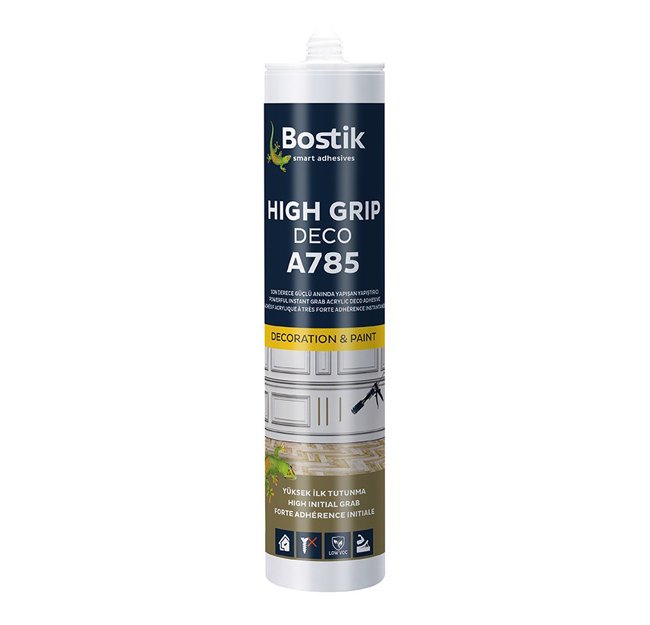 • Bostik A785 HIGH GRIP DECO, özellikle sert PU köpük, polistiren veya sert PVC’ den yapılmış dekoratif profilleri ve rozetleri yapıştırmak için geliştirilmiştir, • Ahşap karolar • Seramik karolar • Akustik paneller • Havalandırma ve PVC kablo kanalları yapıştırmak için de uygundur. |
