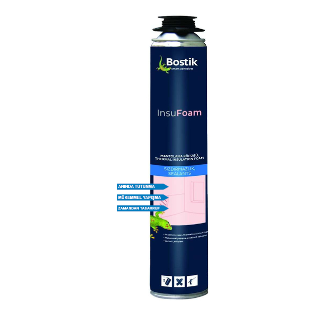 Bostik InsuFoam, özel uygulama tabancası ile kullanılabilen ve havadaki nemle genişleyip kürleşen, başta ısı yalıtım plakalarının, dekoratif panellerin ve çok çeşitli plaka ve panelin hem duvara hem de tavana yapıştırılmasında ve montajında, hem içeride hem de dışarıda kullanılabilen bir aerosol poliüretan köpüktür. Yüksek verim, tekrar kullanılabilirlik ve daha rahat uygulanabilme özelliklerine sahiptir. |