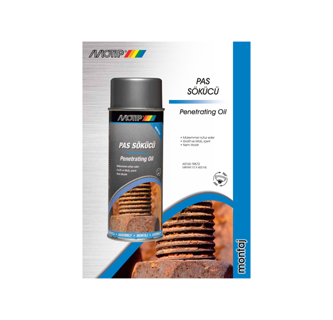 Motip Pas Sökücü Sprey, sürtünmeyi azaltır ve yerine sıkıca oturan vidalı bağlantıların veya paslanmış parçaların sökülmesini kolaylaştırır. Ürün hızlı etki eder , etkilidir ve yer çekimine karşı da olsa (örneğin bi rvida üzerinde) koyar. Motibden sülfit katkısı yağlama gücünü arttırmaktadır. Motip Pas Sökücü metal, kauçuk ve daha birçok plastiğe zarar vermez. |