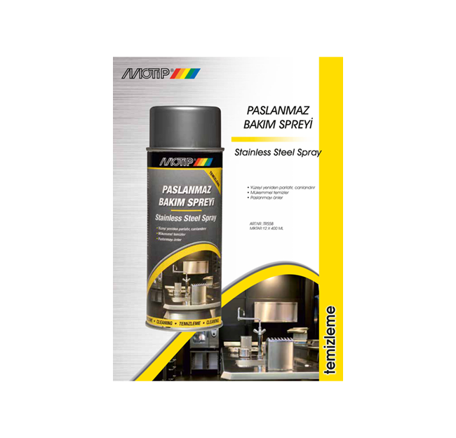 Motip Paslanmaz Bakım Spreyi, paslanmaz çelikten olan parçaların temizliği ve korunması için kullanılır. Özel bileşimi sayesinde temizlikten sonra ince bir koruyucu film oluşur ve bu film yeniden kir birikmesine karşı etki eder. |